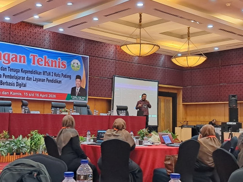 MTsN 2 Kota Padang, Humas-- Hari kedua pelaksanaan Bimbingan Teknis (Bimtek) peningkatan guru dan tenaga kependidikan MTsN 2 Kota Padang berlangsung di Grand Basko Hotel, Air Tawar Padang menghadirkan Gilang Dwi Nanda, Duta Teknologi Provinsi Sumatera Barat sebagai narasumber utama, Kamis (16/04/26).