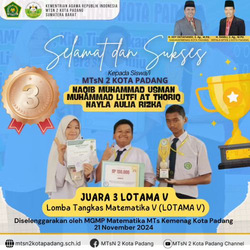 MTsN 2 Kota Padang, Humas – Tiga perwakilan dari MTsN 2 Kota Padang, Naqib Muhammad Usman, Muhammad Lutfi At Thoriq, dan Nayla Aulia Rizka, berhasil meraih juara 3 dalam ajang Lomba Tangkas Matematika V (Lotama V) yang digelar oleh MGMP Matematika MTs Kemenag Kota Padang. Lomba yang diselenggarakan pada Kamis, 22 November 2024, di aula MAN 1 Kota Padang ini diikuti oleh berbagai madrasah dari seluruh Kota Padang.