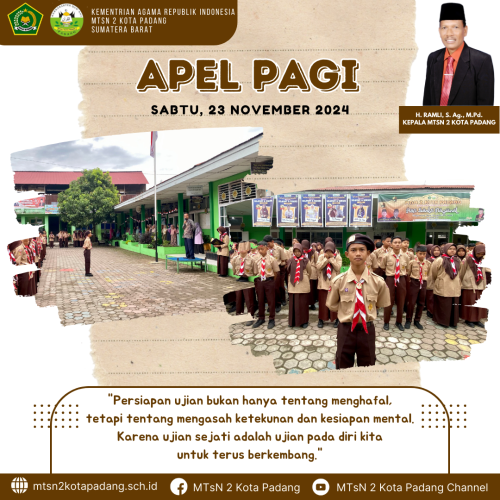 Apel pagi ini menandai komitmen seluruh civitas akademika MTsN 2 Kota Padang untuk terus meningkatkan disiplin, menjaga lingkungan, serta mempersiapkan diri menghadapi ujian dengan penuh tanggung jawab.(DI/SN)