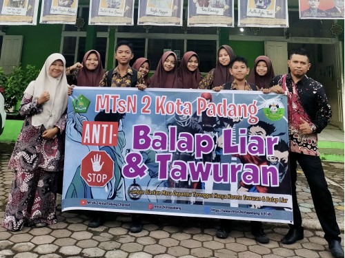 MTsN 2 Kota Padang, Humas – Sebanyak delapan orang siswa MTsN 2 Kota Padang, yang didampingi oleh Pembina OSIM, Adel Sari Rahmi, ikut berpartisipasi dalam kegiatan deklarasi anti tawuran dan balapan liar yang diadakan di Lapangan Imam Bonjol Padang pada Kamis, 6 Februari 2025, pukul 07.00 WIB hingga selesai. Dalam kegiatan ini, para siswa membawa spanduk kampanye sebagai bentuk dukungan terhadap upaya Kepolisian Daerah Sumatera Barat (Sumbar) dan Kepolisian Resort Kota Padang dalam mengantisipasi dan mencegah tawuran serta balapan liar yang kerap meresahkan masyarakat.