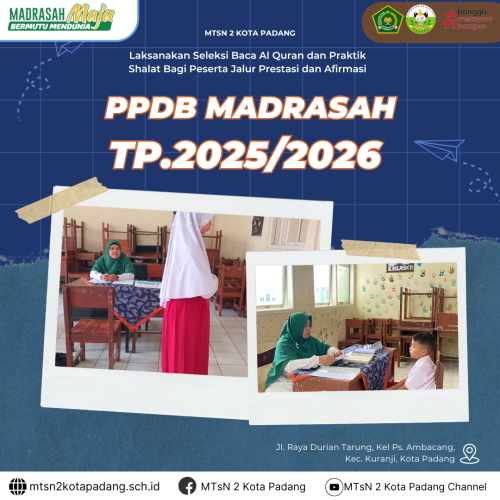 MTsN 2 Kota Padang, Humas – Dalam rangka menyambut Tahun Pelajaran 2025/2026, MTsN 2 Kota Padang mengadakan Penerimaan Peserta Didik Baru (PPDB) untuk jalur Prestasi dan Afirmasi. Salah satu tahapan seleksi yang harus dijalani oleh calon peserta didik adalah tes baca Al Quran dan praktik shalat yang digelar dimadrasah tersebut, Senin (17/3).