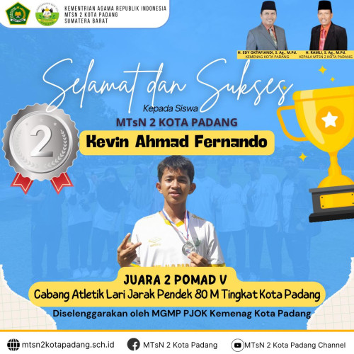 MTsN 2 Kota Padang, Humas - Atletik lari jarak pendek 80 meter menjadi ajang pembuktian bagi Kevin Ahmad Fernando, siswa kelas IX.2 dari MTsN 2 Kota Padang, yang berhasil meraih juara 2 pada Pekan Olahraga Madrasah (POM) Cabang Atletik, yang digelar di Lapangan Wirabraja pada 7 November 2024. Kevin menunjukkan kemampuan luar biasa dalam berlomba, meskipun harus bersaing dengan banyak pelari handal dari berbagai madrasah di kota tersebut. Prestasi ini tak hanya mencerminkan kemampuannya, tetapi juga kerja kerasnya selama berlatih untuk mencapai titik ini.