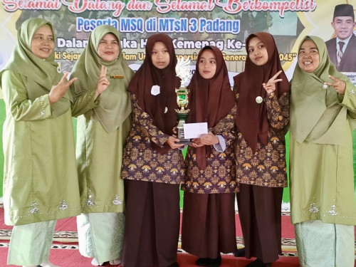 MTsN 2 Kota Padang, Humas – Tiga siswi dari MTsN 2 Kota Padang, yaitu: Yovvi Diandra kelas 8.3, Annisa Fitrah Ramadhani dan Rahtu Cantika kelas 8.1 berhasil meraih juara 3 dalam lomba MSQ yang diikuti oleh sejumlah peserta dari berbagai MTs di Kota Padang. Kegiatan lomba ini dalam rangka memeriahkan Hari Amal Bhakti (HAB) Kementerian Agama (Kemenag) ke-79, yang diadakan oleh MGMP SKI MTs Kota Padang. Lomba Musabaqah Syarhil Qur'an (MSQ) ini berlangsung di MTsN 3 Kota Padang pada hari Rabu, 20 November 2024.